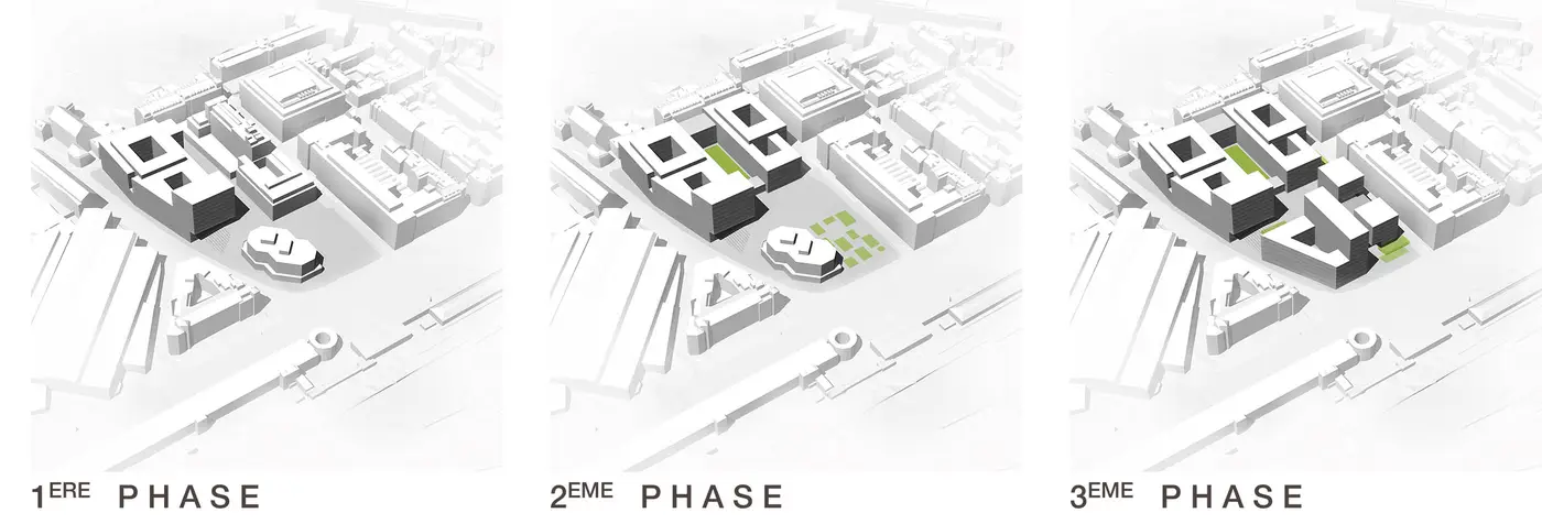 Entwurf eines Stadtquartiers im Zentrum der Stadt Luxemburg für Verwaltungs-, Gewerbe- und Wohnnutzung. Die Realisierung erfolgt in drei Bauabschnitten.