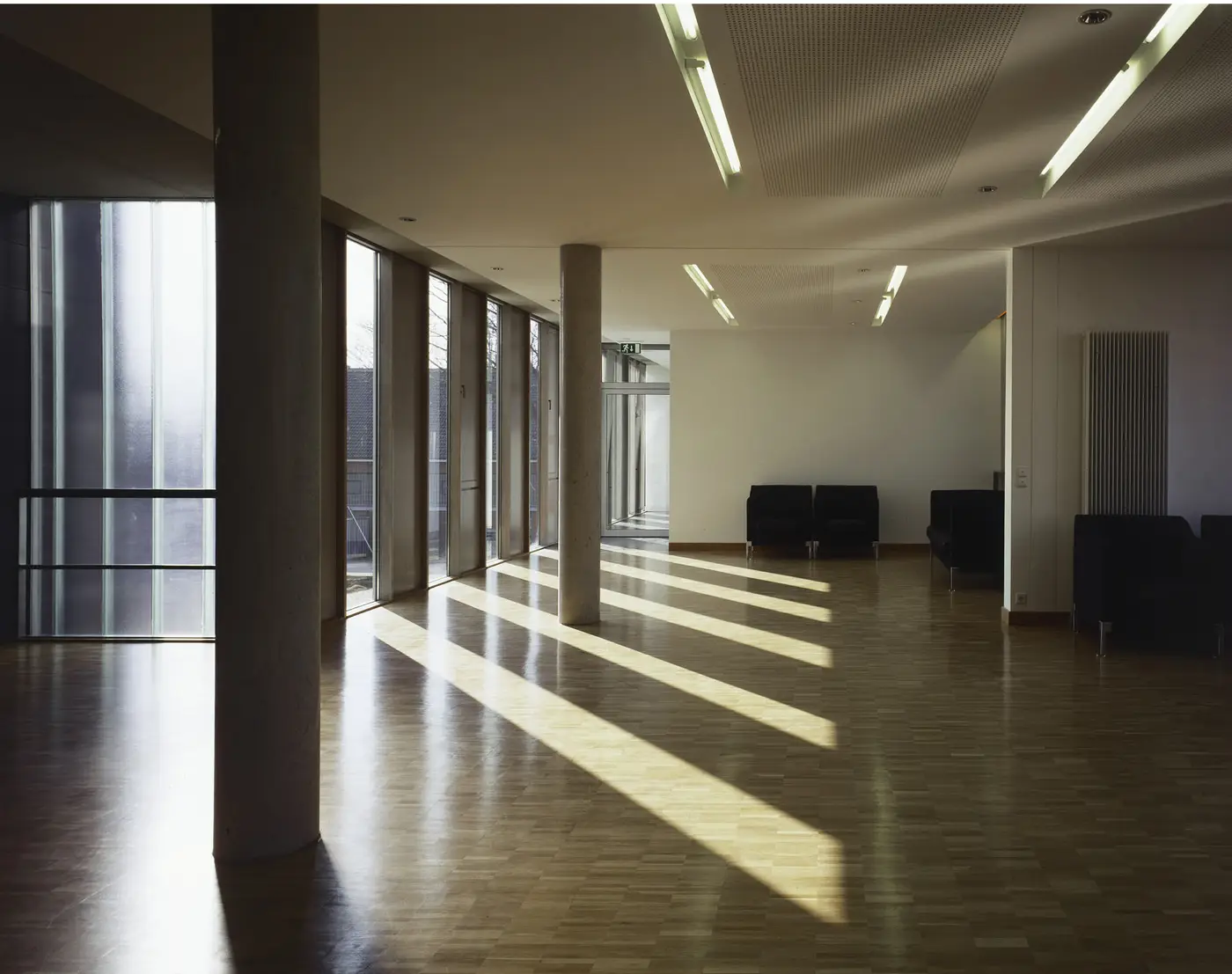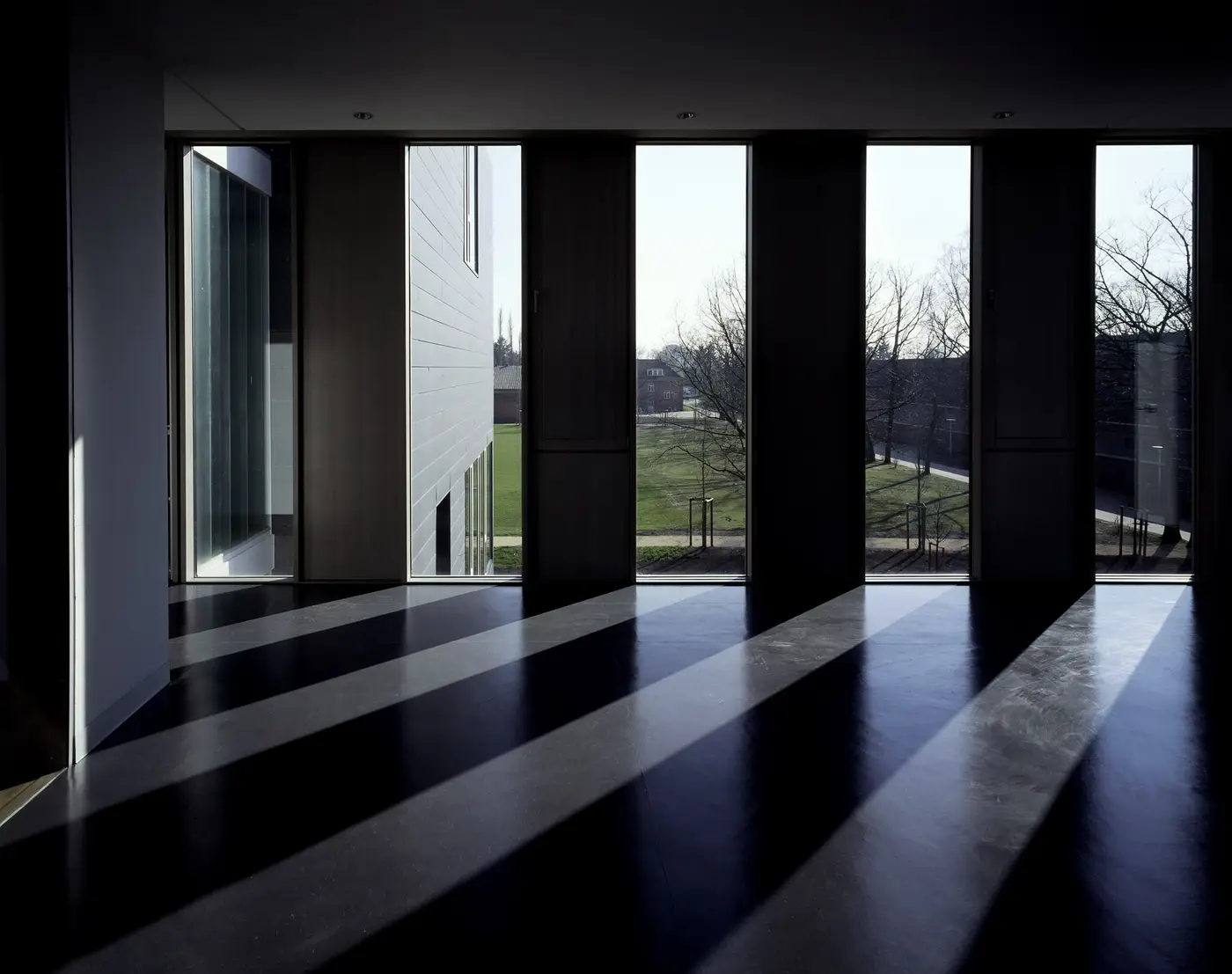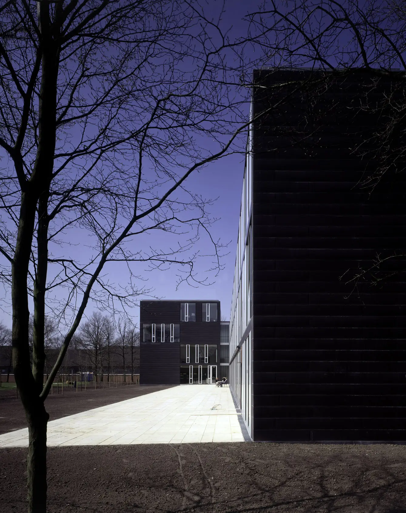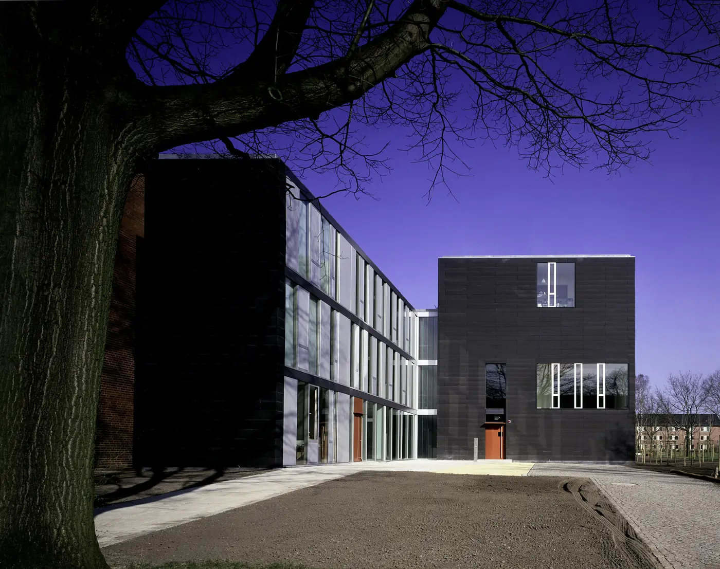 Ein dreigeschossiger Riegel und ein viergeschossiger Kubus verbinden die Altbauten an der Südseite zu einem Gebäude und setzten als erster Neubau auf dem Campus ein architektonisches Zeichen für den Wandel.