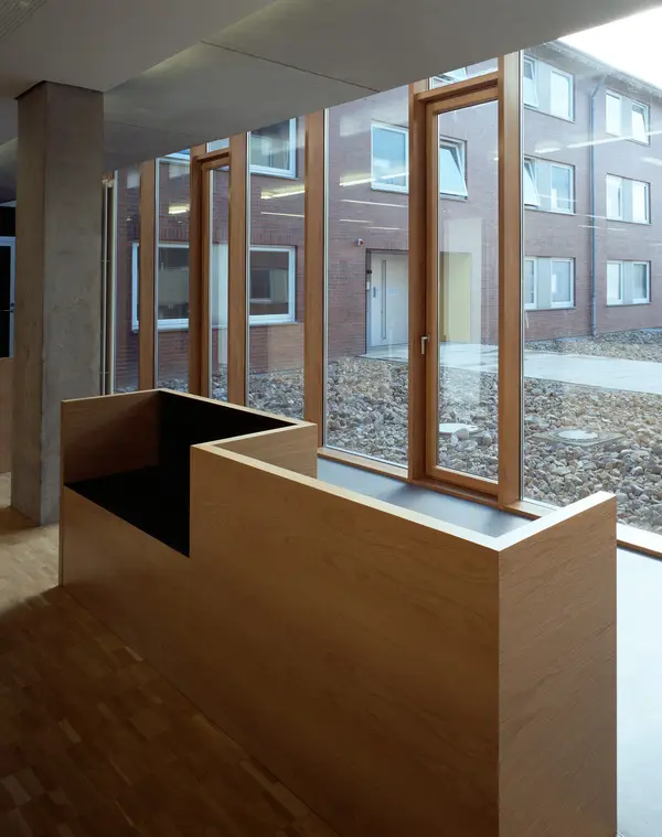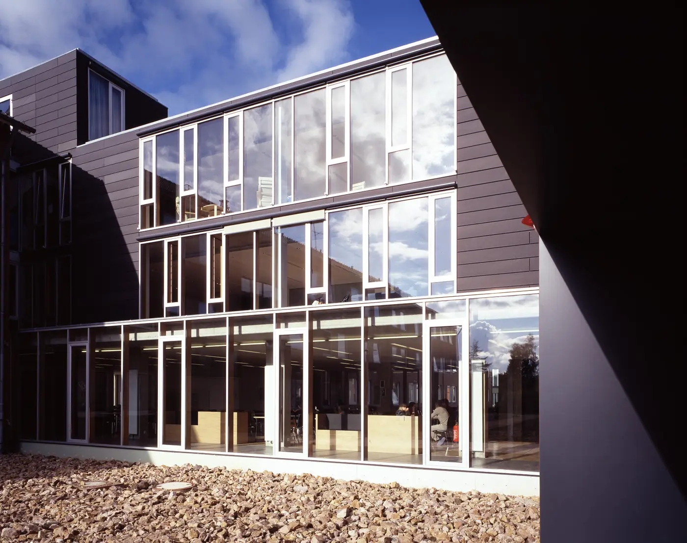 Eleganz und Materialität (schwarzes Zinkblech) des Neubaues bilden wie bei den anderen Colleges einen deutlichen Kontrast zu den Ziegelbauten. Durch die andere Konfiguration der Baukörper erhält dieses College jedoch eine ganz eigene Präsenz auf dem Campus.