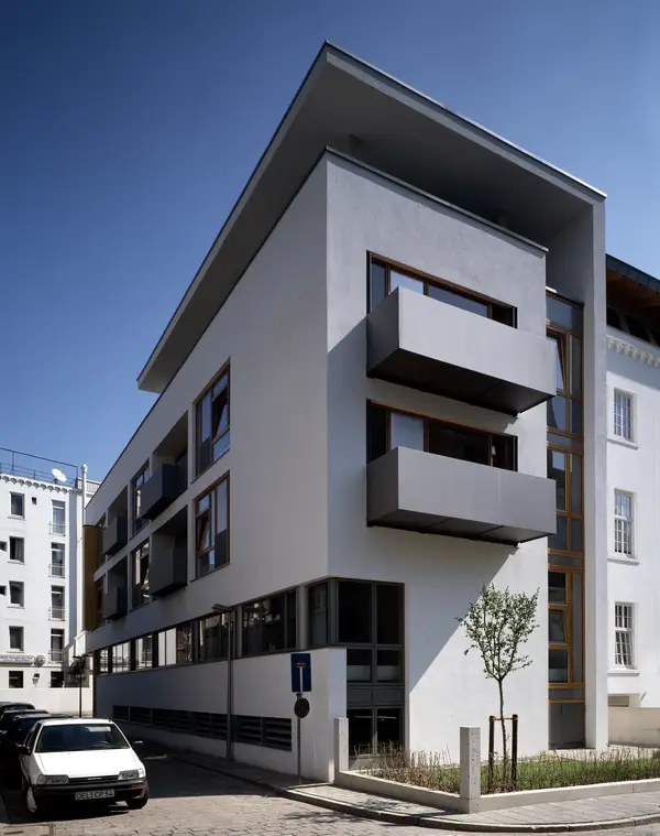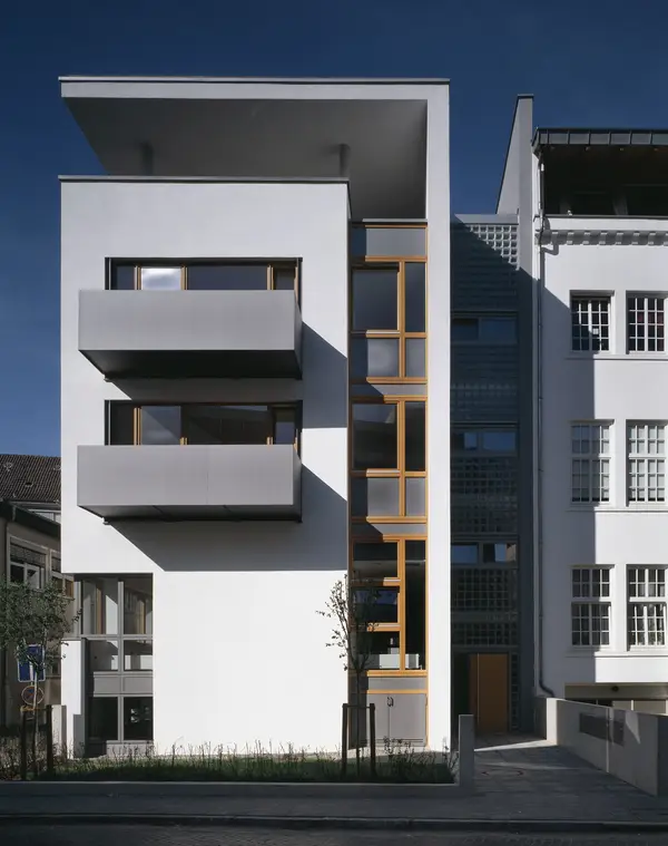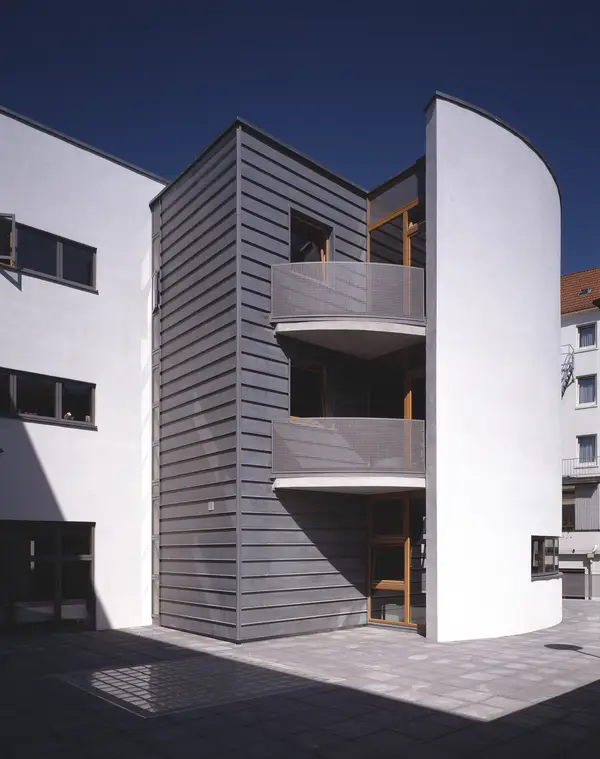 Die architektonische Auseinandersetzung mit dieser Situation, den vorhandenen Altbauten und der Ecklage prägt die Architektur des Gebäudes.