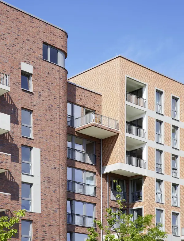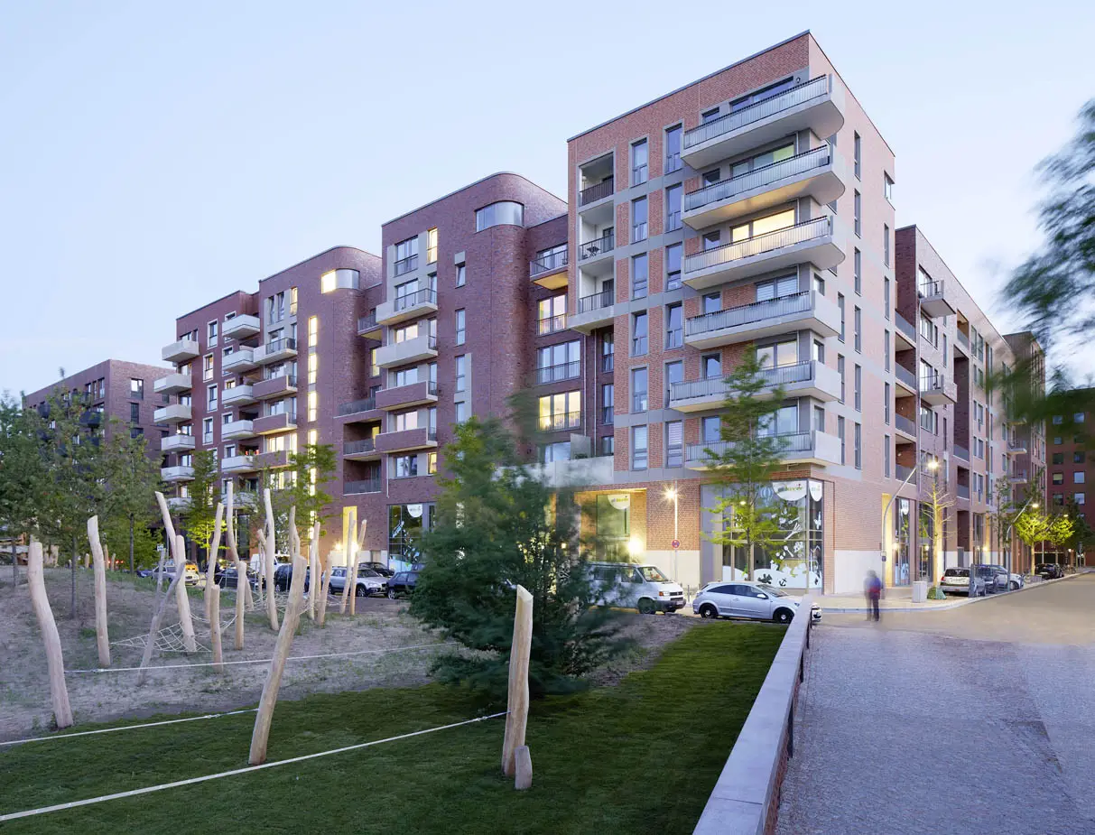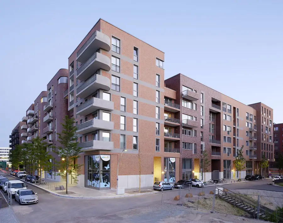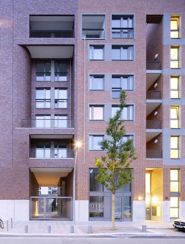 Für die Umsetzung der Materialvorgabe „roter Ziegel“ dient als Referenz die neobarocke Architektur Hamburgs, wie z.B. das HHLA-Gebäude in der Speicherstadt, die mit ihrem Spiel von Ziegel und Naturstein besonders geeignet zu sein scheint, ein gleichermaßen anspruchvolles wie wohnliches Ambiente zu erzeugen.