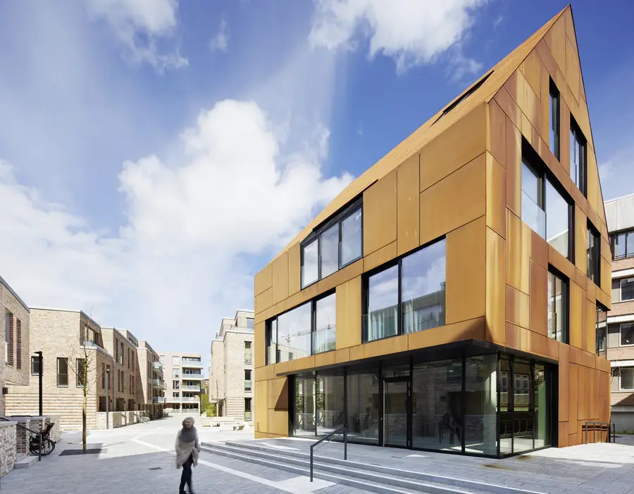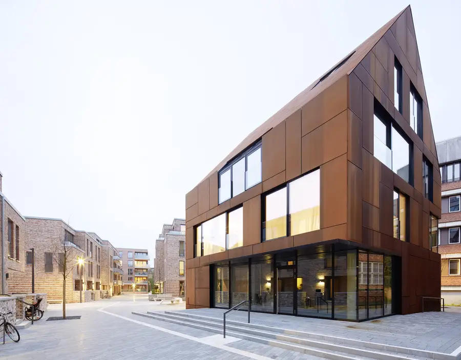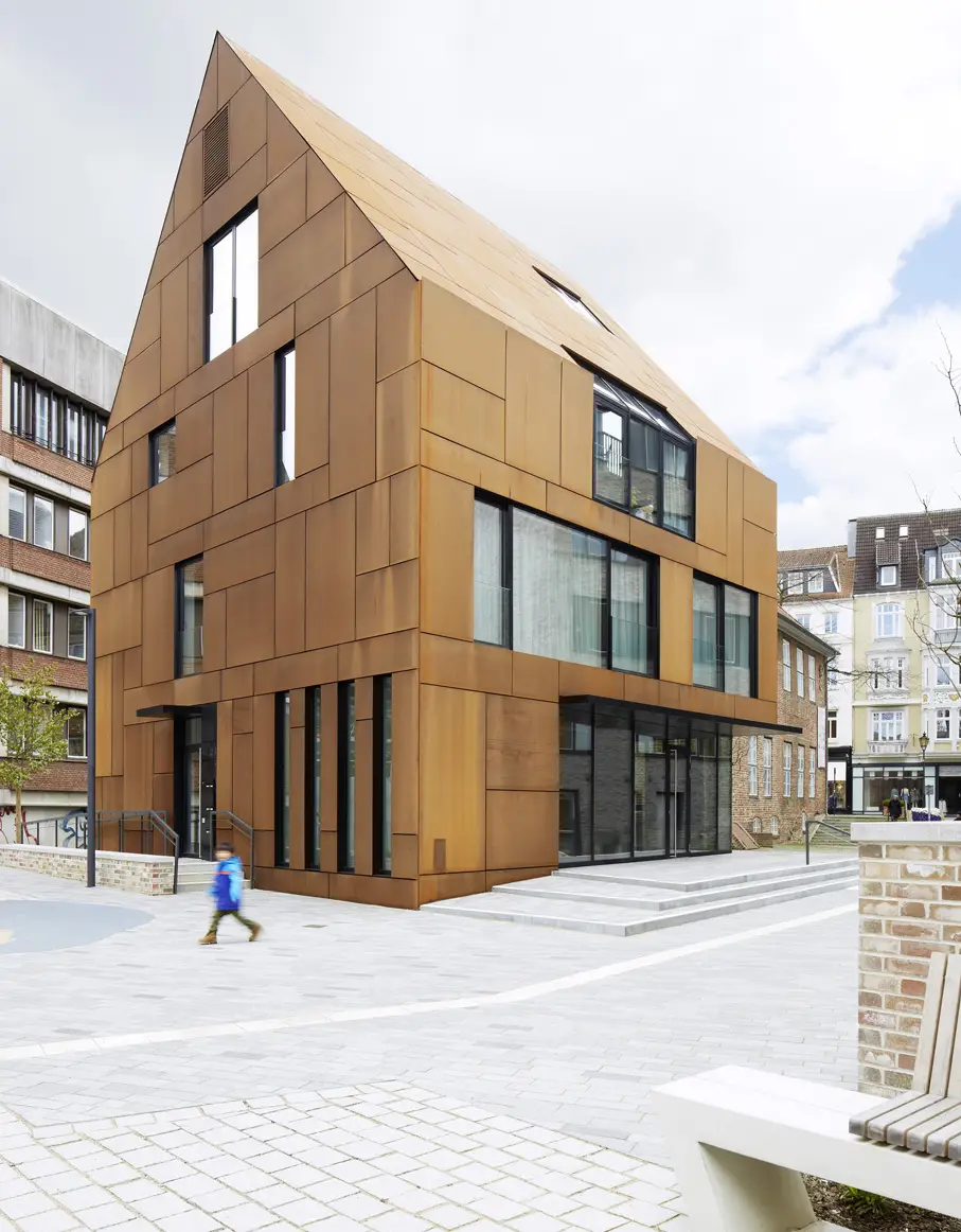 Südlich, dem Kulturdenkmal „Warleberger Hof“ benachbart, bildet ein vollständig mit Cortenstahl bekleidetes Satteldachhaus mit zwei exklusiven Loftwohnungen und einer Gewerbeeinheit im Erdgeschoss eine eigenständigen Akzent und markiert den städtischen Zugang zum Quartier.