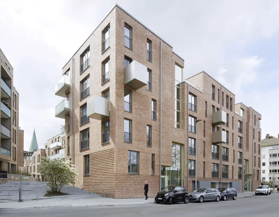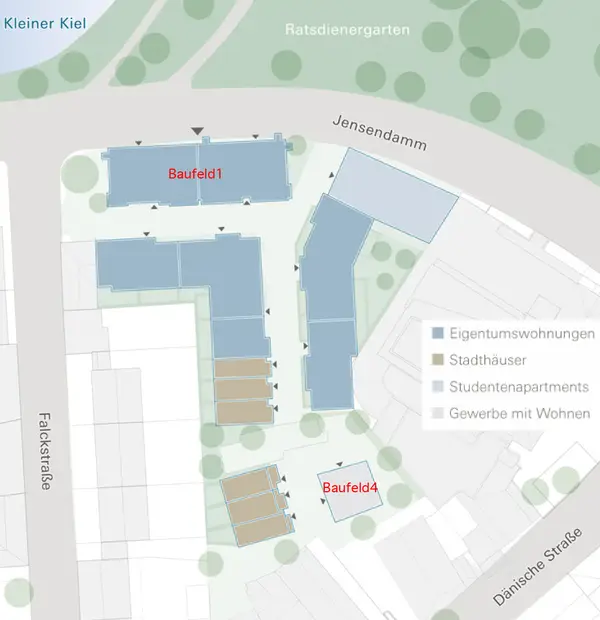 Zwei der sieben Baufelder werden von BLK2 Architekten entwickelt. Angrenzend an den Ratsdienergarten und den Kleinen Kiel bilden zwei fünfgeschossige Mehrfamilienhäuser den nördlichen Abschluss am Jensendamm und bieten 19 attraktive Wohnungen mit Blick zum Park. Einschnitte der Dachterrassen gliedern den Baukörper, roter Ziegel vereint alle Häuser und fügt das Quartier in das Stadtbild.