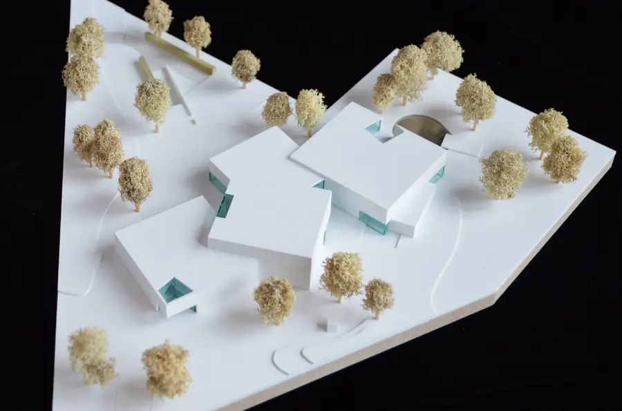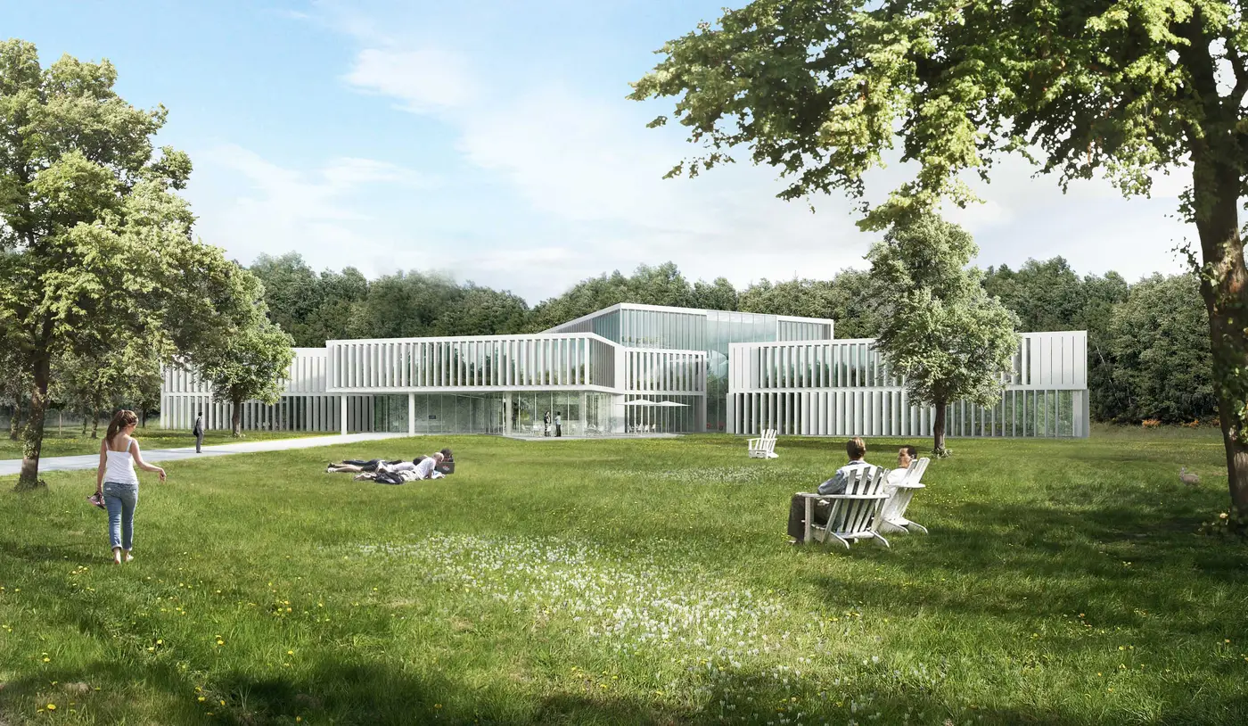 Vier sich durchdringende zweigeschossige Quader bilden eine bauliche Skulptur, die sich mit dem umgebenden Park verzahnt. Zentrales Element ist der innere Weg, der die Häuser und dezentralen Lernstationen verbindet und vielfältige Sichtbezüge zum Außenraum anbietet.
