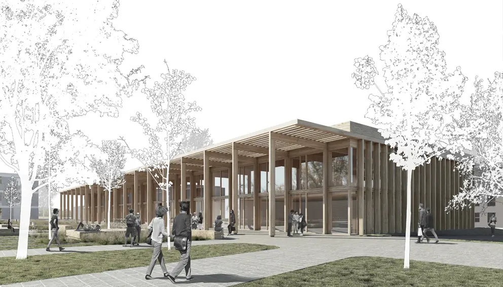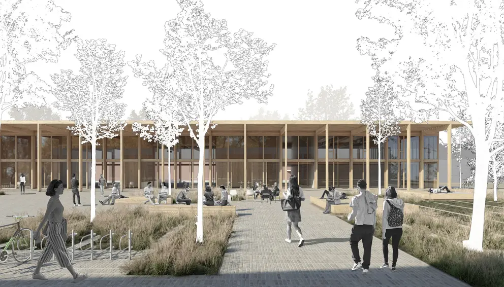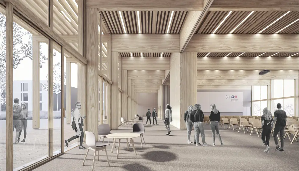 Das neue Aula-, Schulungs- und Bibliotheksgebäude soll einerseits den städtebaulichen Zusammenhang wieder herstellen und gleichzeitig im Dialog mit dem geplanten Mensagebäude eine neue Mitte bilden. Ein lang gestreckter zweigeschossiger Baukörper soll diese beiden städtebaulichen Funktionen übernehmen.