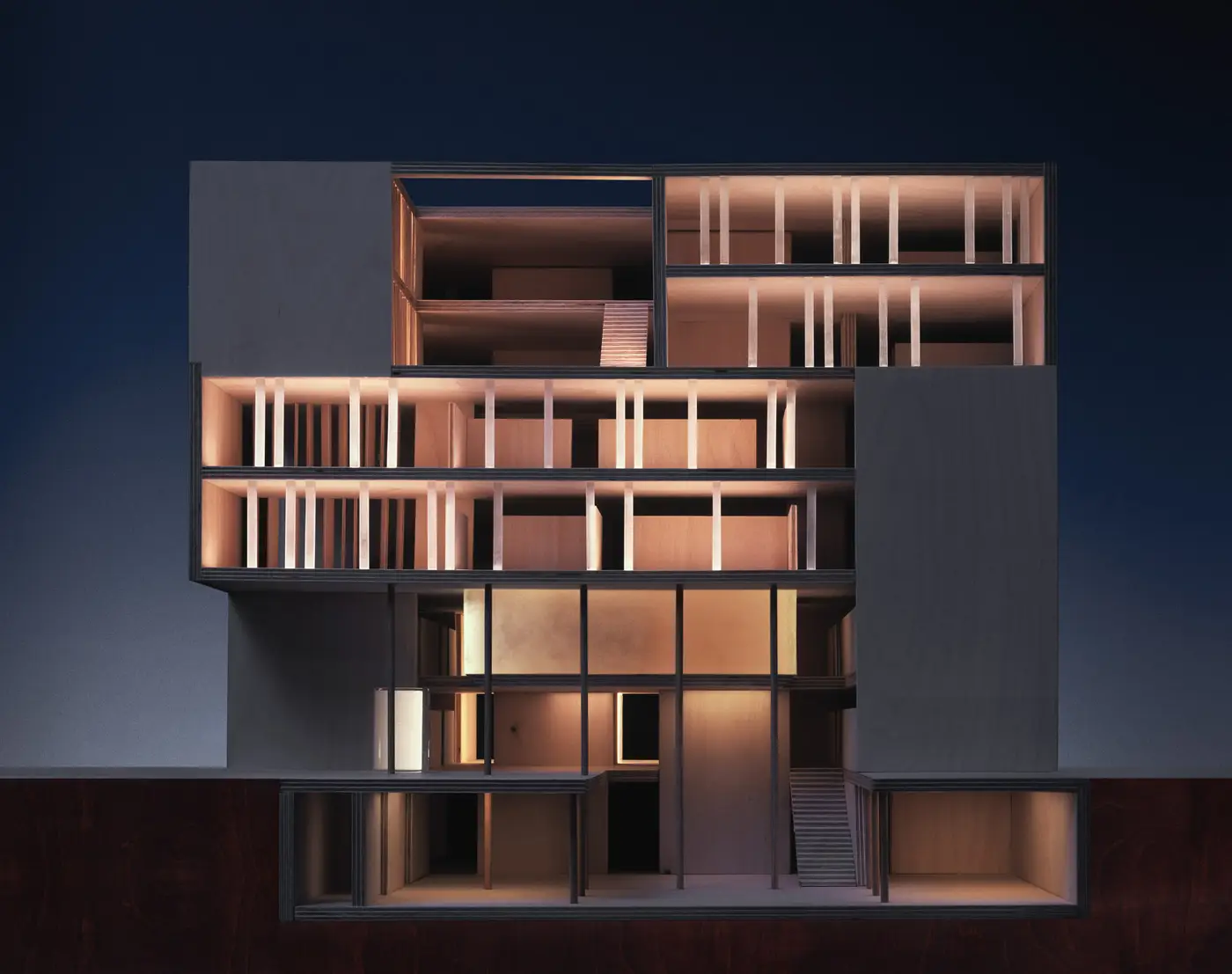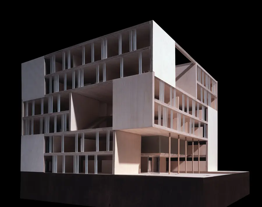 Die Durchlässigkeit des Gebäudes zum Außenraum prägt auch seine Innenräume. Zweigeschossige Lufträume in den Verkehrszonen, im Versatz zu den Winter- gärten schaffen eine Kommunikation fördernde Atmosphäre und vielfältige Blickbeziehungen im Inneren und nach Außen. Alle Flurzonen sind von großer räumlicher Qualität und natürlich belichtet und belüftet.