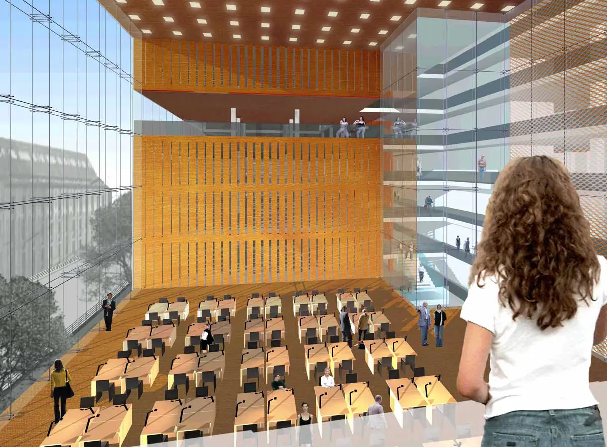 Der Kubus mit den sparsamen Öffnungen bildet den Speicher, der die Bestände der Bibliothek bewahrt und beschützt. Horizontal und vertikal wird dieser Speicher durchdrungen von den Licht durchfluteten Lesesälen und -ebenen.