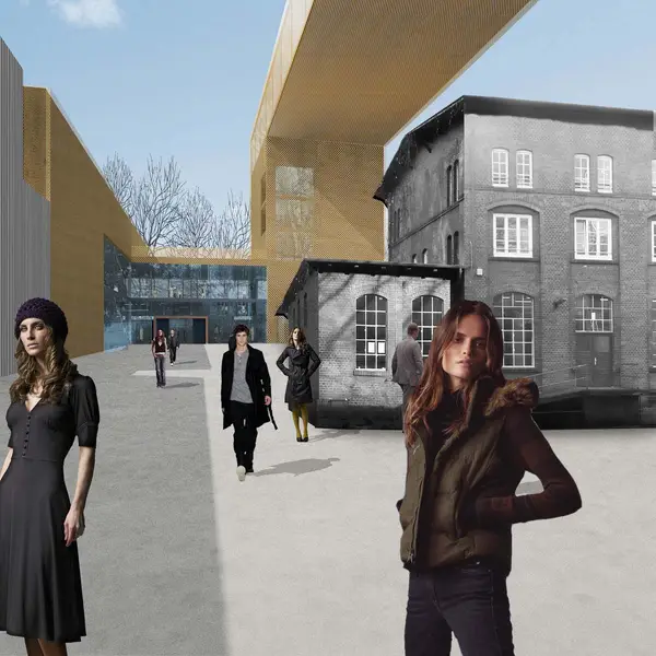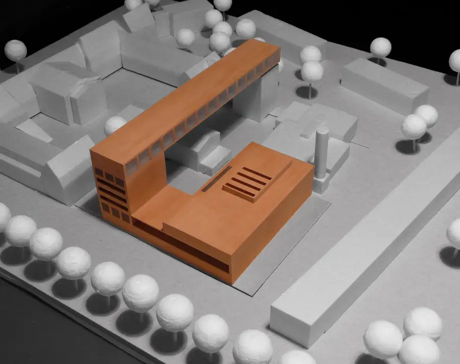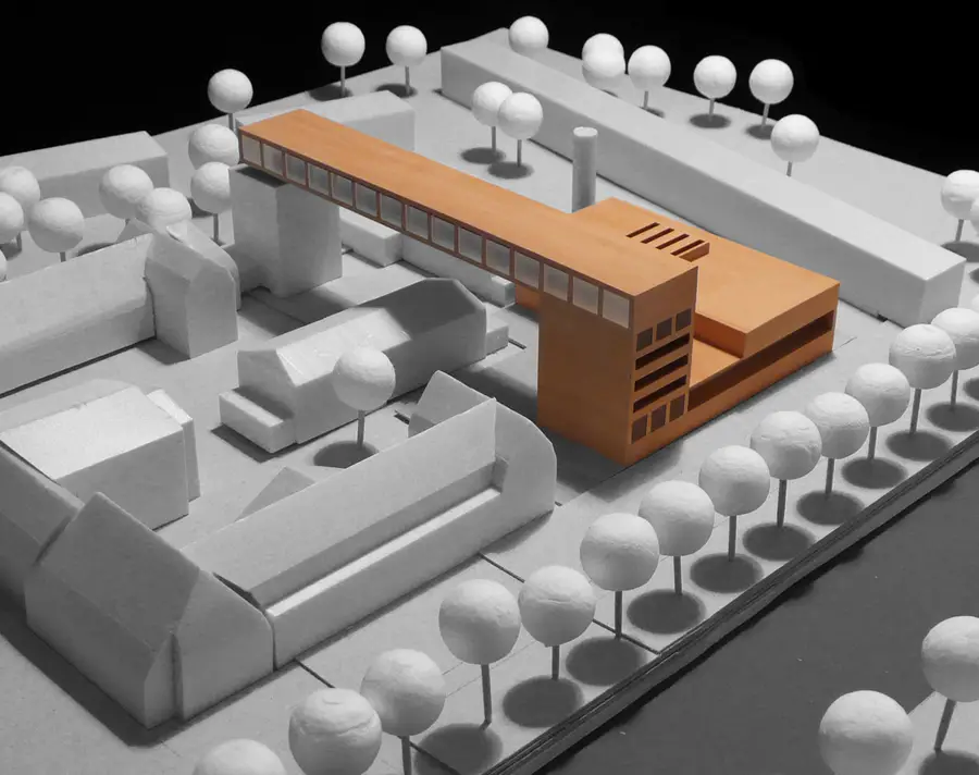 Die klare, symmetrische Disposition des bestehenden Schuhmacher-Baues wird durch den Bunker und das neue Studiogebäude erheblich gestört. Als Fixpunkte werden sie jedoch in das Gesamtkonzept integriert. Der Neubau schließt an das Studiogebäude an und formuliert als Winkel den Campusabschluss. Aus diesem Winkel entwickelt sich jedoch ein Hochpunkt der in eine große Brücke übergeht, die auf dem gegenüberliegenden Bunker endet.