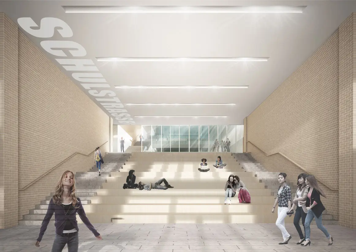Ein 5-geschossiger kubischer Baukörper, mit seiner Längsseite parallel zur Wartiner Straße ausgerichtet, besetzt das nordwestliche Baufeld. Die künftige Sporthalle wird dem Schulhaus angegliedert, ist von der Straße zurückgesetzt und bietet so auf Höhe der Einmündung Biesenbrower Straße Raum für einen Schulvorplatz. Im Übergangsbereich von Schule und Sporthallenneubau verbindet das Foyer den Vorplatz mit rückwärtigen Schulhofflächen. Angeschlossen an den Eingangsbereich sind zur Sporthallenseite der Mehrzweckraum mit der Mensa und an der Wartiner Straße der Medienbereich mit der Schulbliothek. Eine große, mittig gelegene Freitreppe mit Sitzstufen als kommunikativer Treffpunkt leitet in die Obergeschosse.