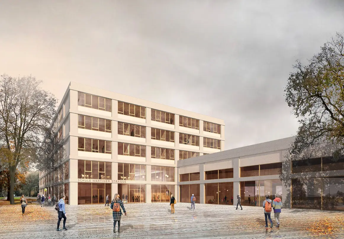 Die Wettbewerbsaufgabe Schulstandort Wartiner Strasse bietet auf den ersten Blick grosszügige Bedingungen. Großer Bedarf an Sport- und Pausenflächen, Vorhalteflächen für öffentlichen Nahverkehr und das geplante Budget aber lassen einen kompakten Schulbau sinnvoll erscheinen.