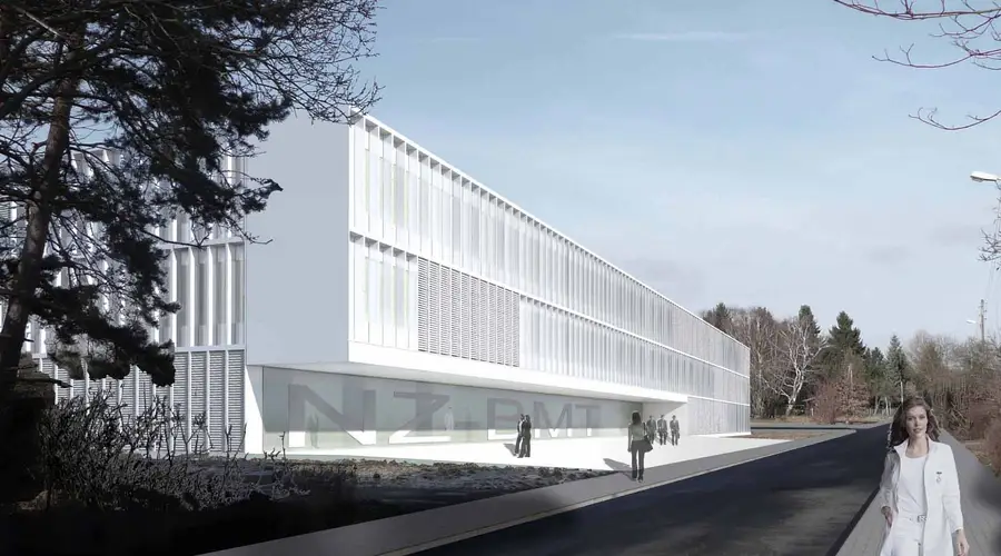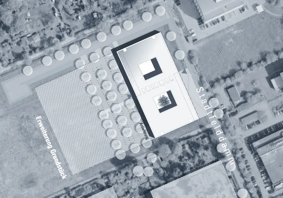 Die rationale Klarheit der Fassade und die weiße Farbe charakterisieren Inhalt und Bedeutung seiner Funktion. Die Mitte des Hauses erhält mit einer kleinen, dreigeschossigen Halle ein kommunikatives und zurückhaltend repräsentatives Zentrum