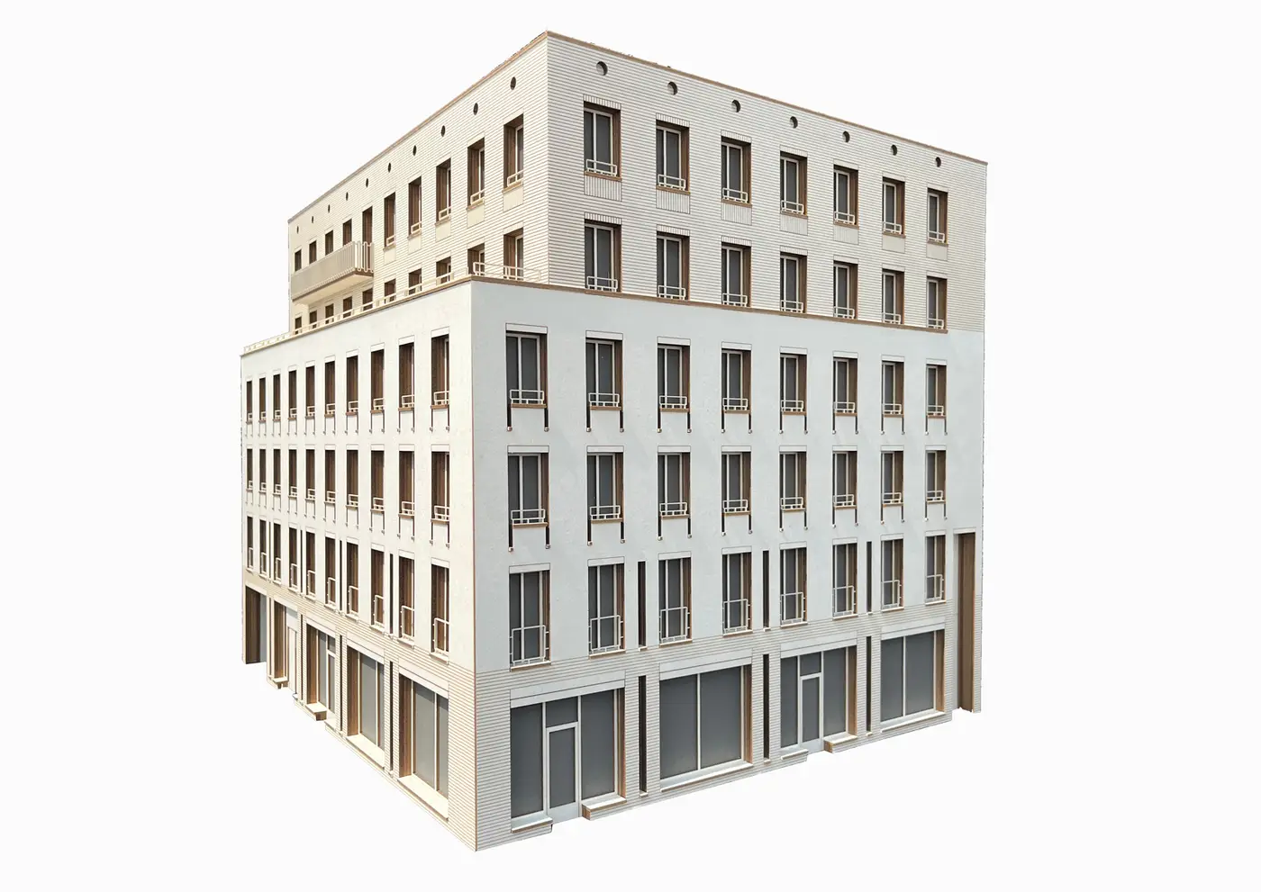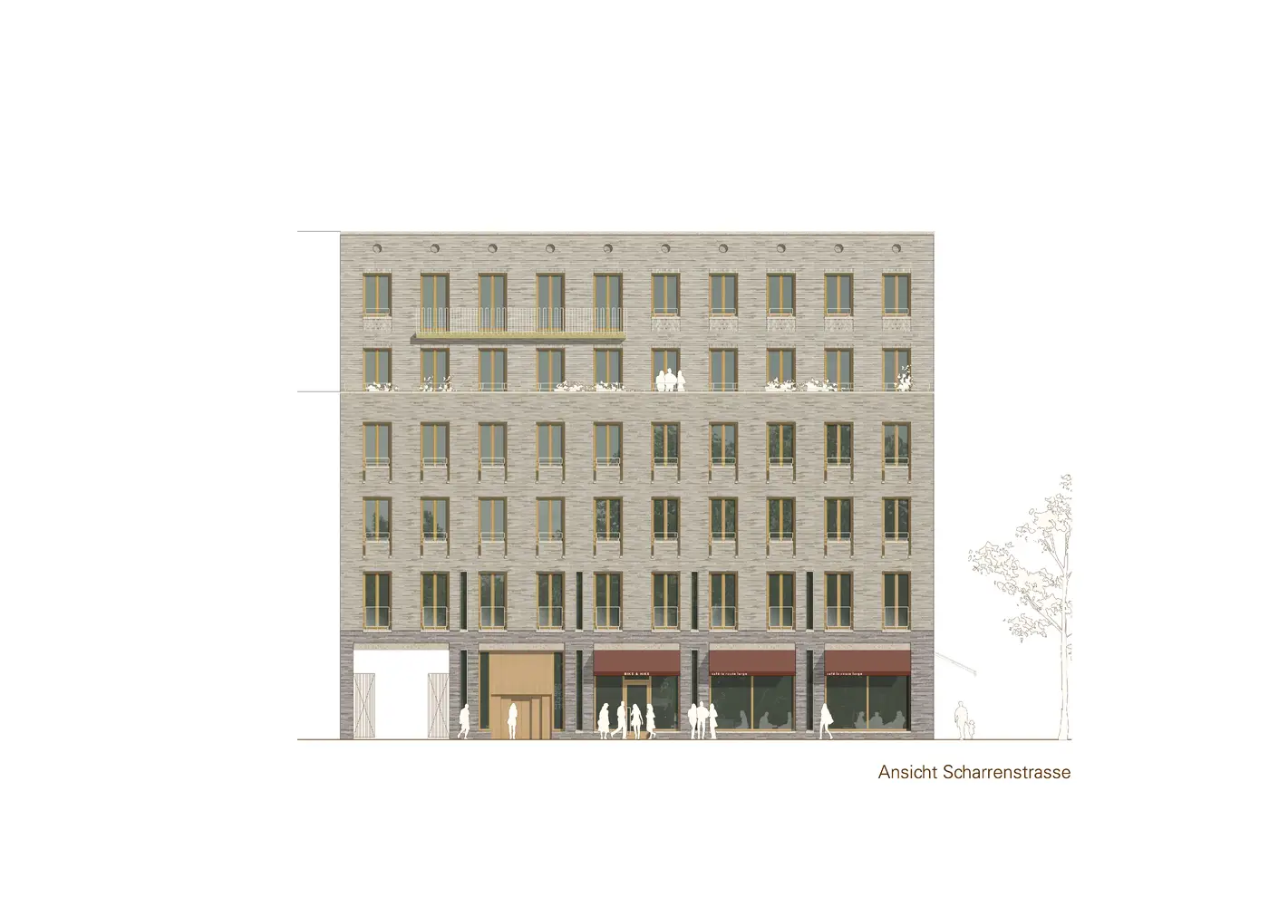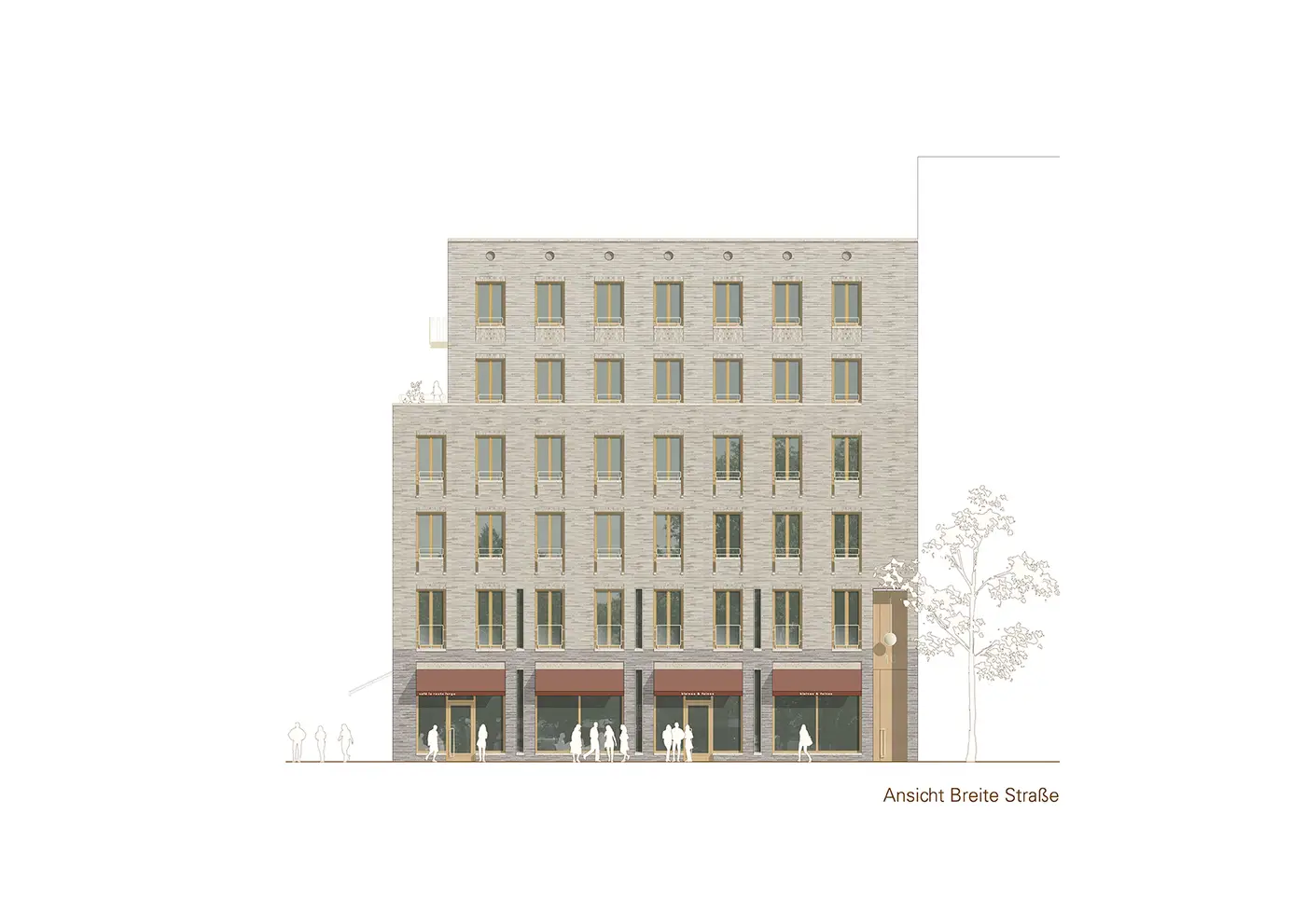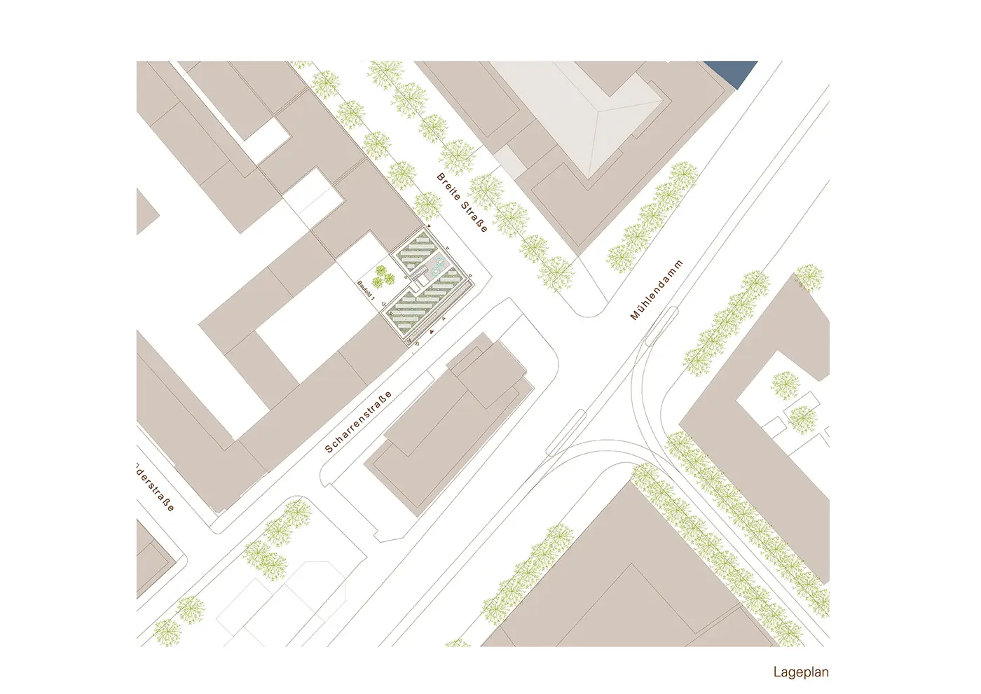 Durch die Ecklage des Baukörpers an der Scharrenstraße und der Breiten Straße wird das Gebäude als Übergang zu den kommenden vielfältig gestalteten Blockrandbebauungen der Scharrenstraße sowie der Breiten Straße verstanden.