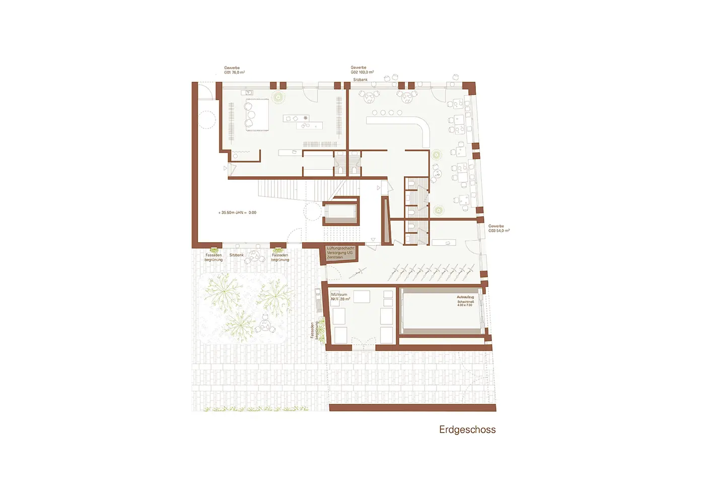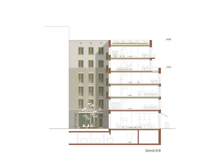 Der repräsentative und gezielt platzierte Erschließungskern, der kompakte Baukörper mit robuster, langlebiger Tragstruktur und die integrierte einfache Low-Tech-Infrastruktur für die technischen Anlagen bilden die Grundlage für einen dauerhaften und wirtschaftlichen Betrieb. Großzügig bemessene Geschosshöhen, gleichmäßig gereihte Fensteröffnungen mit hoher Tageslichtausbeute bei gleichzeitig ausgewogenem Wandanteil erlauben auch zukünftige, heute noch nicht absehbare, vielfältige Nutzungen.