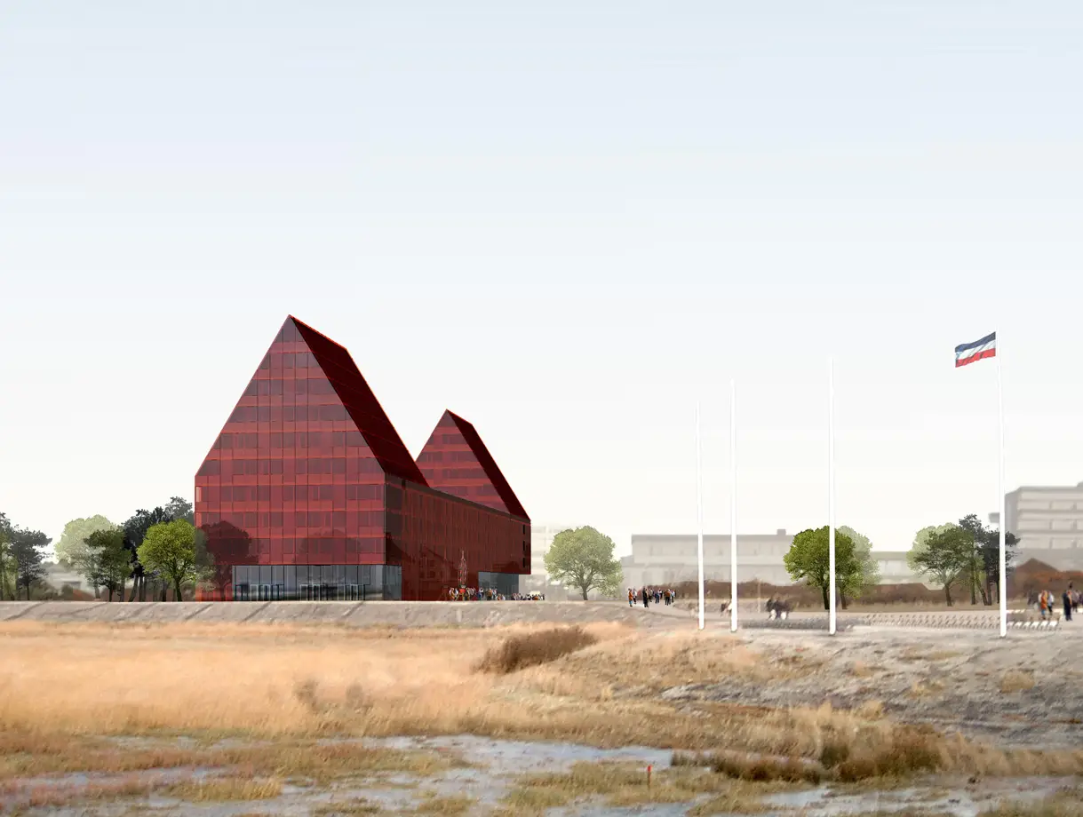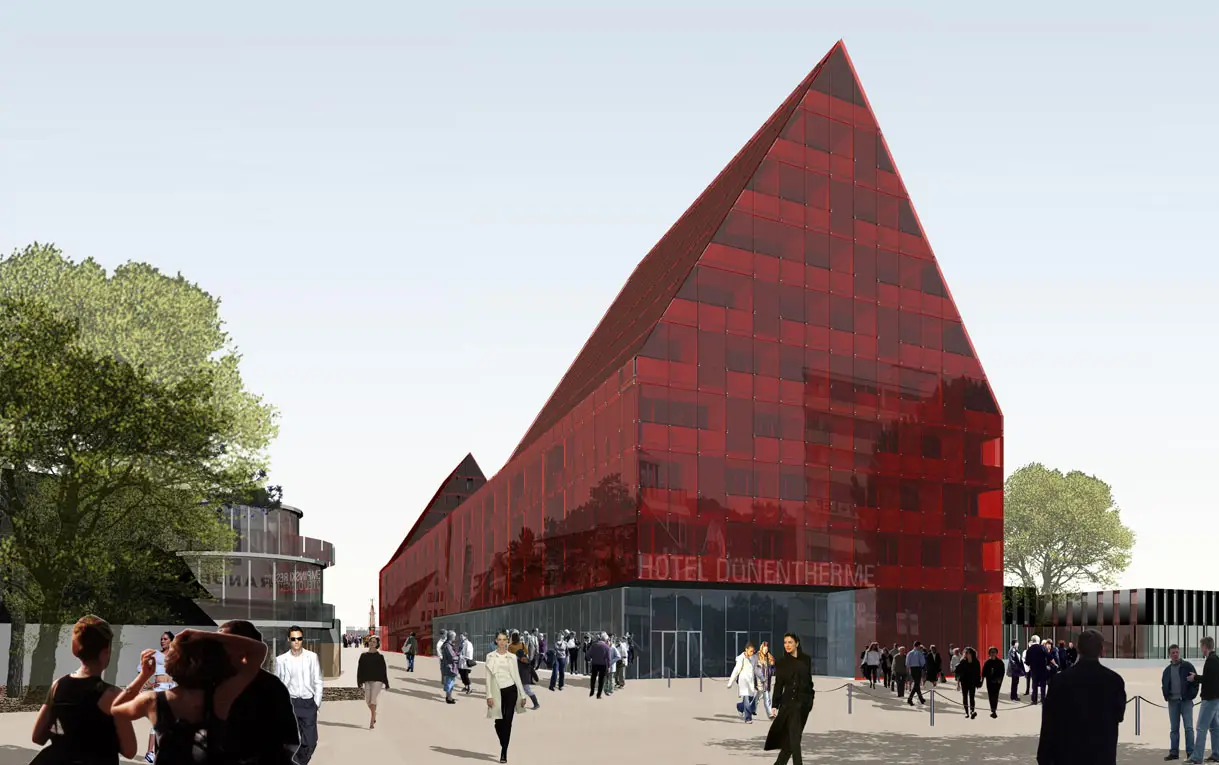 Ein viergeschossiger Baukörper entlang der Straße Am Kurbad erhält an beiden Enden einen fünfgeschossigen, giebelförmigen Aufbau, der sowohl zum Ort als auch zum Meer eine einprägsame, fast archetypische Form erzeugt, wie sie auch in den typischen Bauten der nordfriesischen Landschaft, z.B. den Haubargen, angelegt ist. Diese einfache, vertraute Form wird jedoch durch die Verwendung von rot bedruckten, semitransparenten Gläsern für die Fassaden- und Dachflächen zu einem ungewöhnlichen und neuen Objekt, und damit zu einer modernen, zeitgenössischen Architektur.