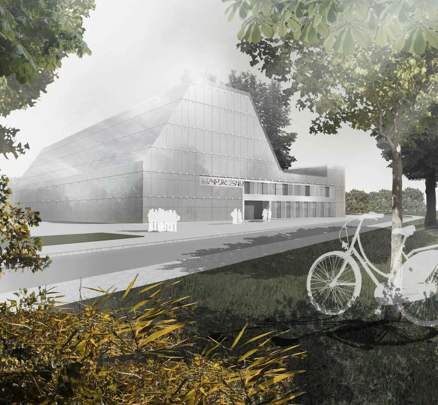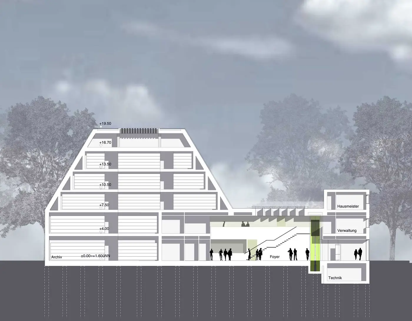 Ziel des Entwurfes ist es, das Staatsarchiv mit einer prägnanten Form, entwickelt aus der Kultur und Geschichte seiner Landschaft, zum städtebaulichen Zeichen und Maßstab seiner Umgebung zu machen.