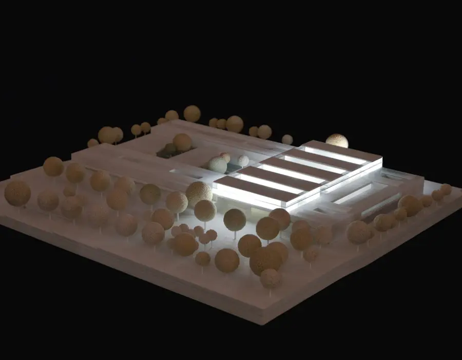 Oberhalb dieser zentralen Zone ist das zweigeschossige Gästehaus mit schmalen Riegeln und Höfen angeordnet.