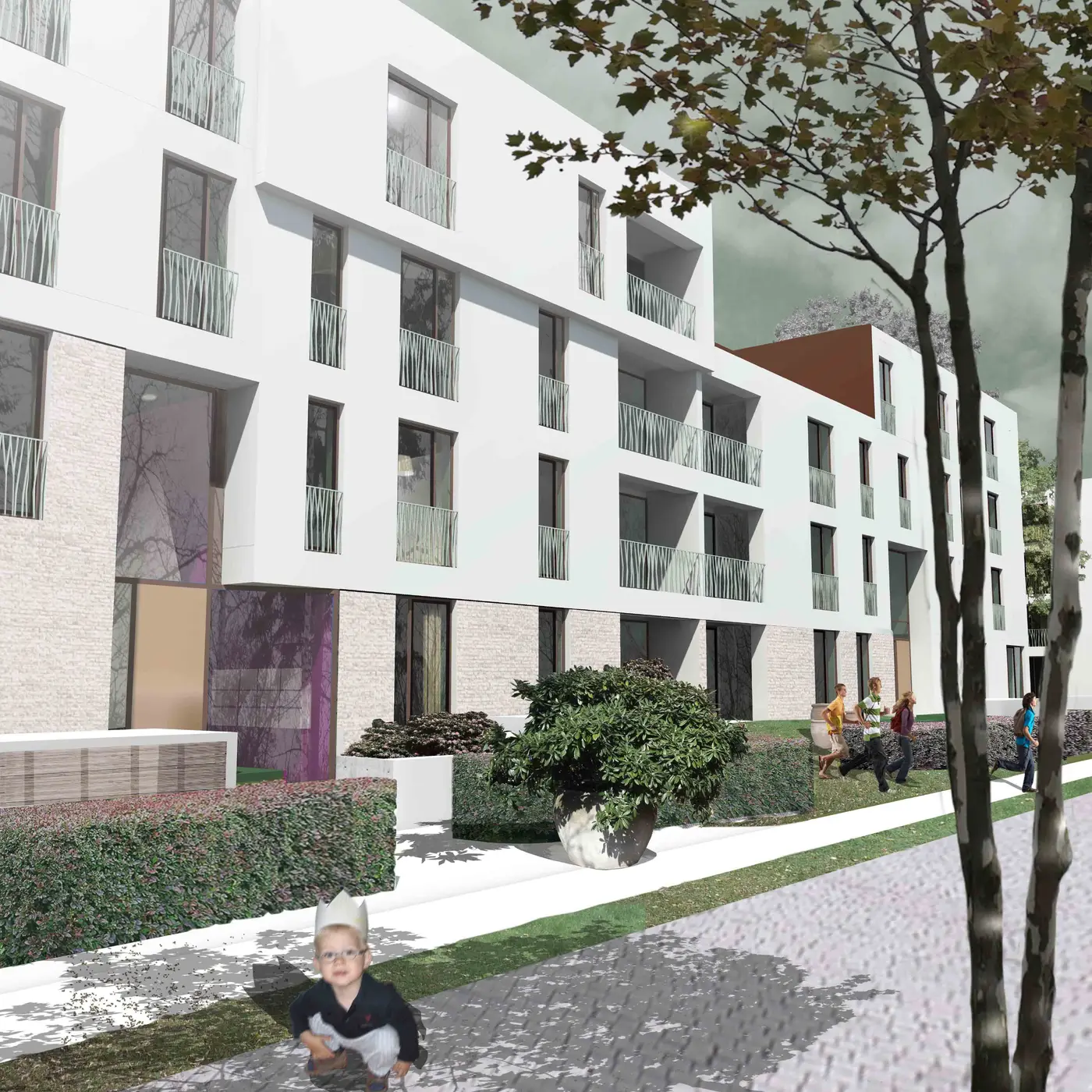 Die Baukörper werden durch Einschnitte in den oberen Geschossen kubisch gegliedert, um eine maßstäbliche Beziehung zu den angrenzenden Einfamilienhäusern herzustellen.